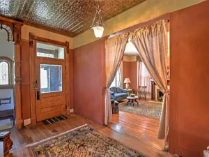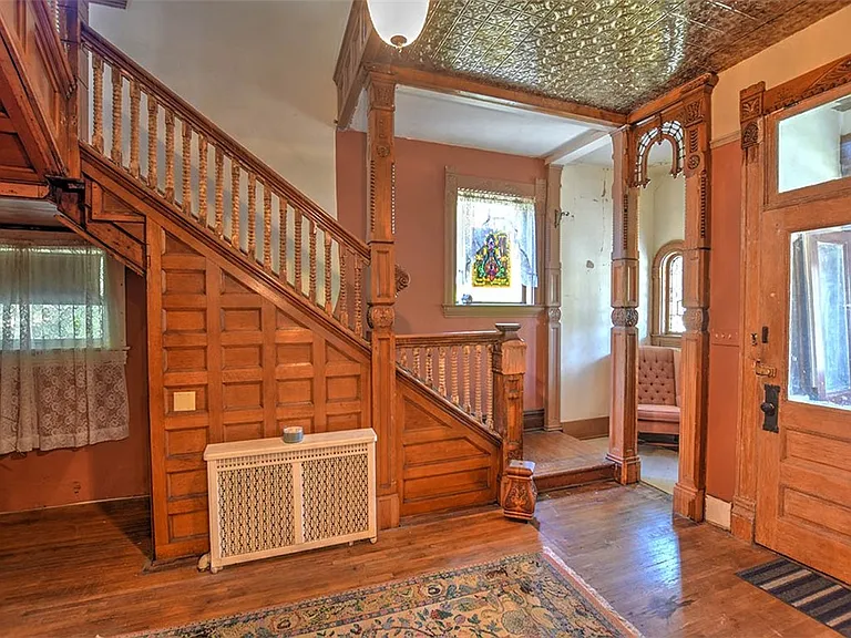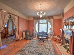 From the moment you arrive, the impressive curb appeal of this stately residence sets the tone. The welcoming wraparound porch is perfect for enjoying a quiet morning with coffee or unwinding in the evenings. Enter through the grand double doors into a spacious foyer adorned with hand-carved oak staircase, original moldings, and rich wood paneling that reflect the elegance of Victorian-era design.