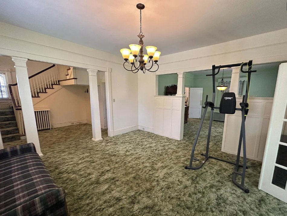 Step through the front door, and you’ll find yourself in a world of vintage character waiting to be rediscovered. The living room is centered around a traditional fireplace, providing warmth and charm to the heart of the home. Original wood floors peek out from beneath old carpeting, likely preserved and ready to be refinished to their former glow. Wide baseboards, picture rails, and arched doorways highlight the craftsmanship that was common in homes of this era but rare today.