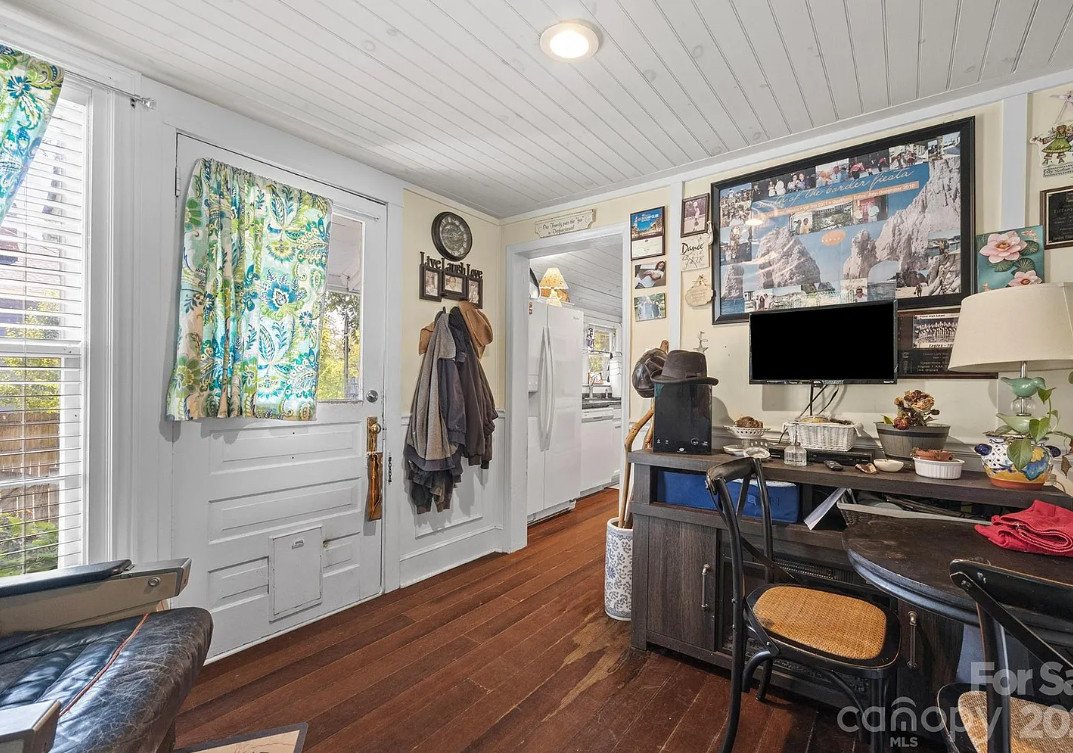 From the moment you arrive, the home’s curb appeal sets the tone. The small covered porch is both welcoming and picturesque, framed by simple columns and accented with period-appropriate details that hint at the character within. Step through the antique, hand-carved front door, and you’ll immediately sense the home’s history and craftsmanship. High ceilings, original hardwood floors, and wide baseboards combine to create a timeless elegance, while the glow of natural light highlights every detail.