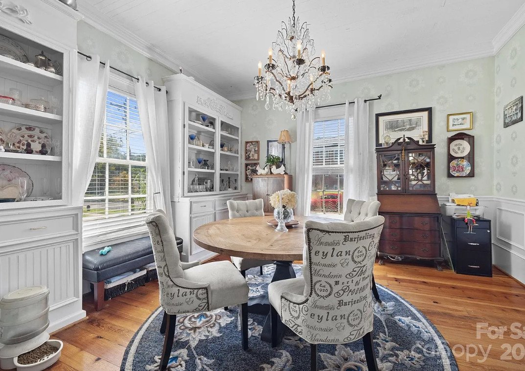 Just beyond, the dining room continues the charm with matching built-ins and more decorative trim. It’s easy to imagine candlelit dinners here, surrounded by the soft warmth of wood tones and the gentle hum of conversation. The craftsmanship throughout the home reflects a time when every detail was considered, and every feature served both form and function.