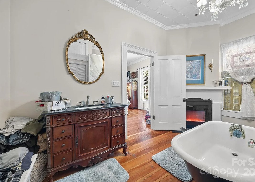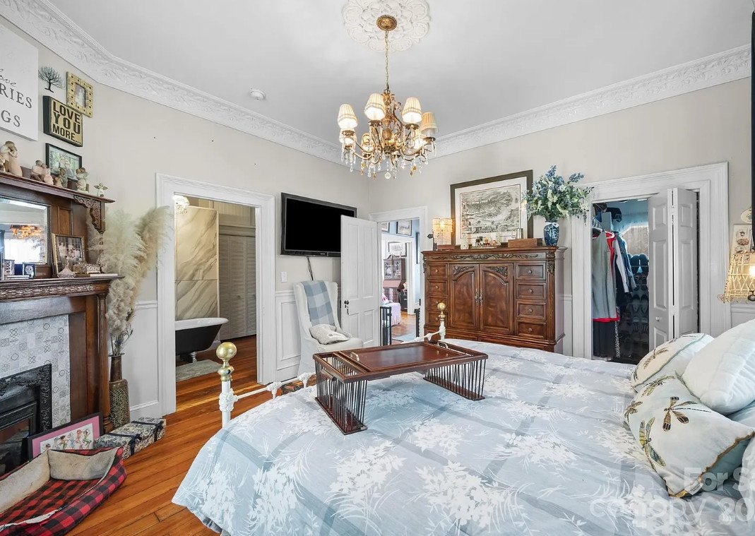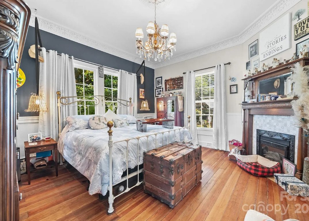 The primary suite is a peaceful retreat, blending old and new with grace. Two closets provide ample storage—rare for a home of this era—while the remodeled bathroom feels like a luxurious escape. Here, a clawfoot tub and a tiled shower stand side by side, offering both history and comfort. The addition of an electric fireplace brings a touch of warmth and romance, perfect for quiet evenings spent unwinding after a long day.