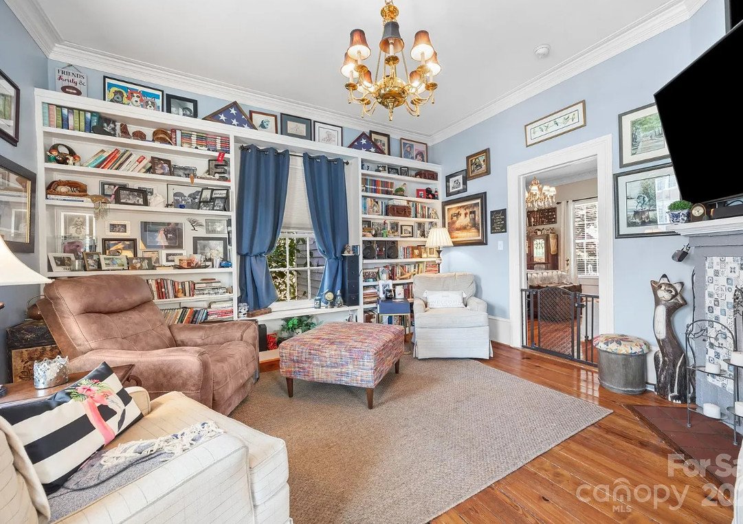 The living room is an intimate space that feels both classic and comfortable. Built-in bookshelves line the walls, offering the perfect spot to display treasured heirlooms or a favorite collection of novels. Crown molding and wainscoting frame the room, giving it a sense of refinement that harkens back to early 20th-century design. A graceful chandelier hangs from the ceiling, adding just the right touch of old-world sophistication.