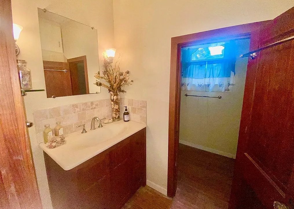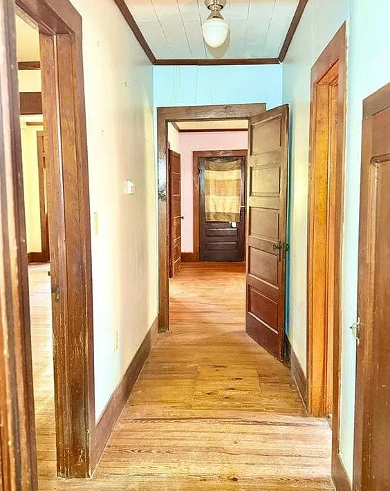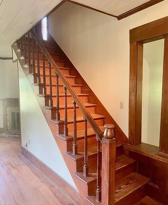 One of the most captivating aspects of this 1885 residence is its unpainted woodwork—an exceptional feature today, as so many historic homes have long since lost their original finishes. Inside, unpainted baseboards, trim, and solid wood doors speak to a different era of carpentry, one that valued natural grain, handcrafted details, and materials chosen with longevity in mind. The doors retain their original hardware, adding yet another layer of authenticity to the interior.