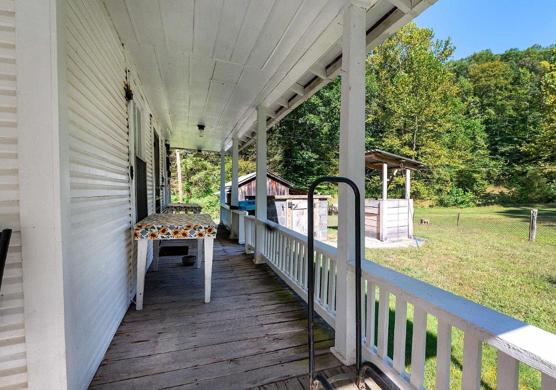 A covered porch wraps along two sides of the structure, offering views over the property and providing shelter from sun, rain, and the mountain winds. Homes of this period often prioritized practicality, and this one shows exactly that: the layout is simple, the rooms straightforward, and the materials enduring.