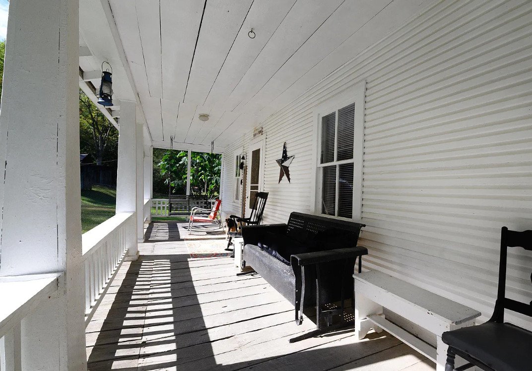 A covered porch wraps along two sides of the structure, offering views over the property and providing shelter from sun, rain, and the mountain winds. Homes of this period often prioritized practicality, and this one shows exactly that: the layout is simple, the rooms straightforward, and the materials enduring.