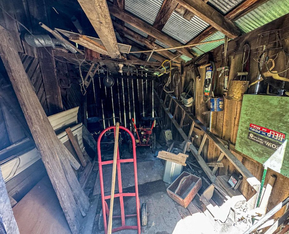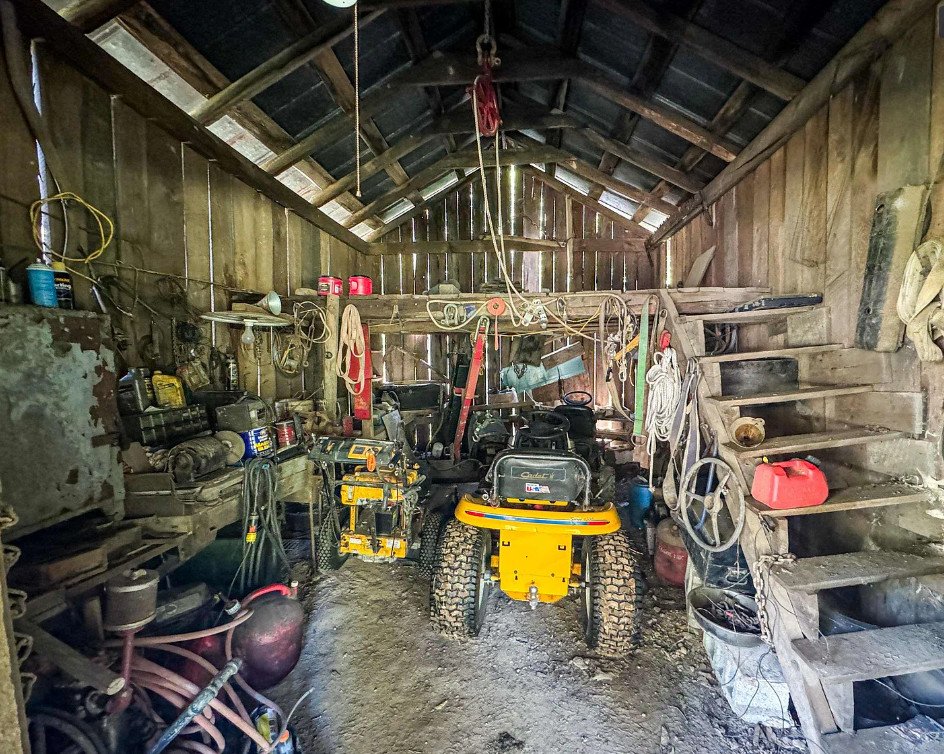 What sets this property apart, however, is not only the house, but the collection of outbuildings scattered across the acreage. Among them stands an old blacksmith shop, a rare survival and an important link to the practical skills that once sustained Appalachian communities. The structure still carries the atmosphere of its working days, when tools were forged, equipment repaired, and neighbors dropped by with broken hardware needing a quick fix. Beside it stand additional buildings, including a corn crib and various storage structures, each one offering possibilities for restoration, repurposing, or historical preservation.