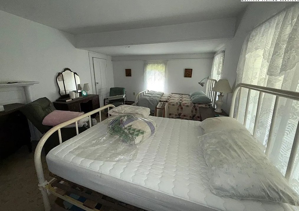 Upstairs, the home offers three bedrooms, each shaped by the character of sloping ceilings, dormers, and early-era proportions. Natural light fills these spaces, highlighting the serene atmosphere created by the combination of age and preservation. Although the home measures approximately 1,532 square feet, the thoughtful layout and generous porch extend the living experience far beyond its square footage.
