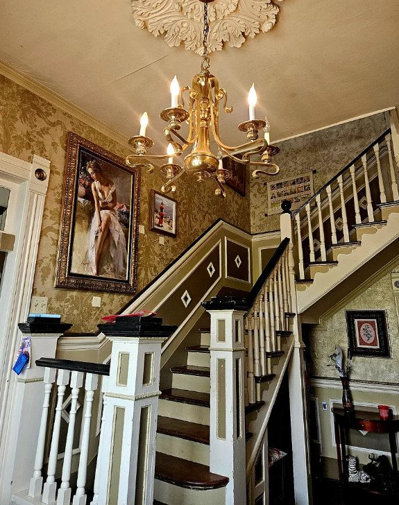 Stepping through the front door, guests are greeted by a grand staircase that commands attention with its graceful curve and polished wood finish. Above, a pretty chandelier casts a warm glow, illuminating the entryway and setting a refined tone that carries throughout the entire house.