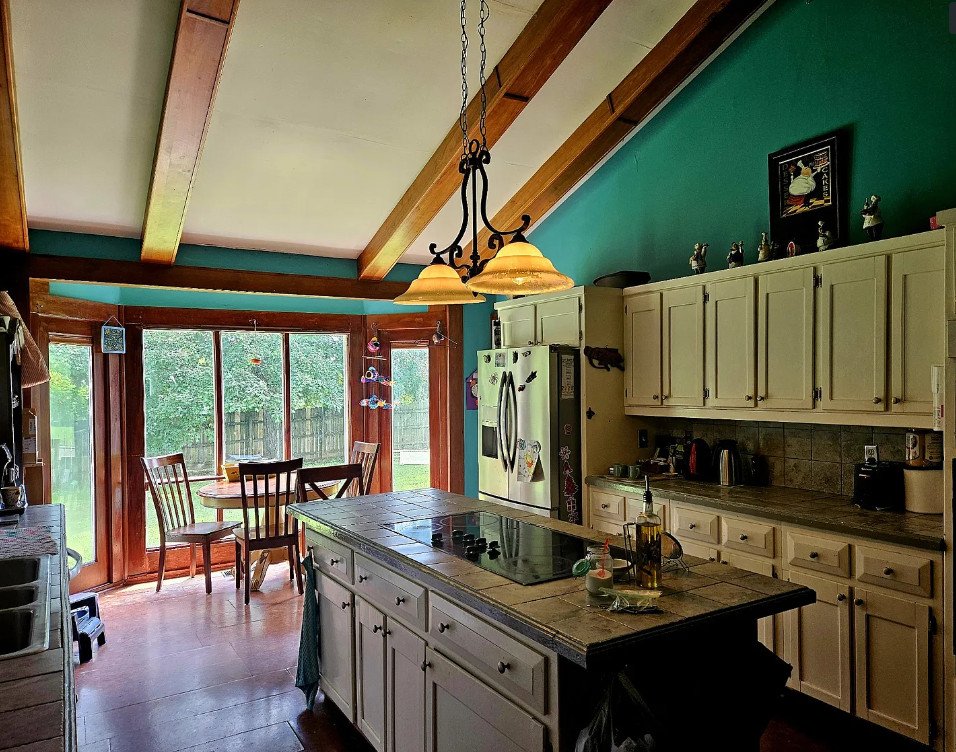 The kitchen includes vaulted ceilings with beams, a tile backsplash, contemporary counters, and an open feeling that makes it ideal for gathering and cooking. Its connection to the home’s historic elements strengthens the sense of continuity between past and present.