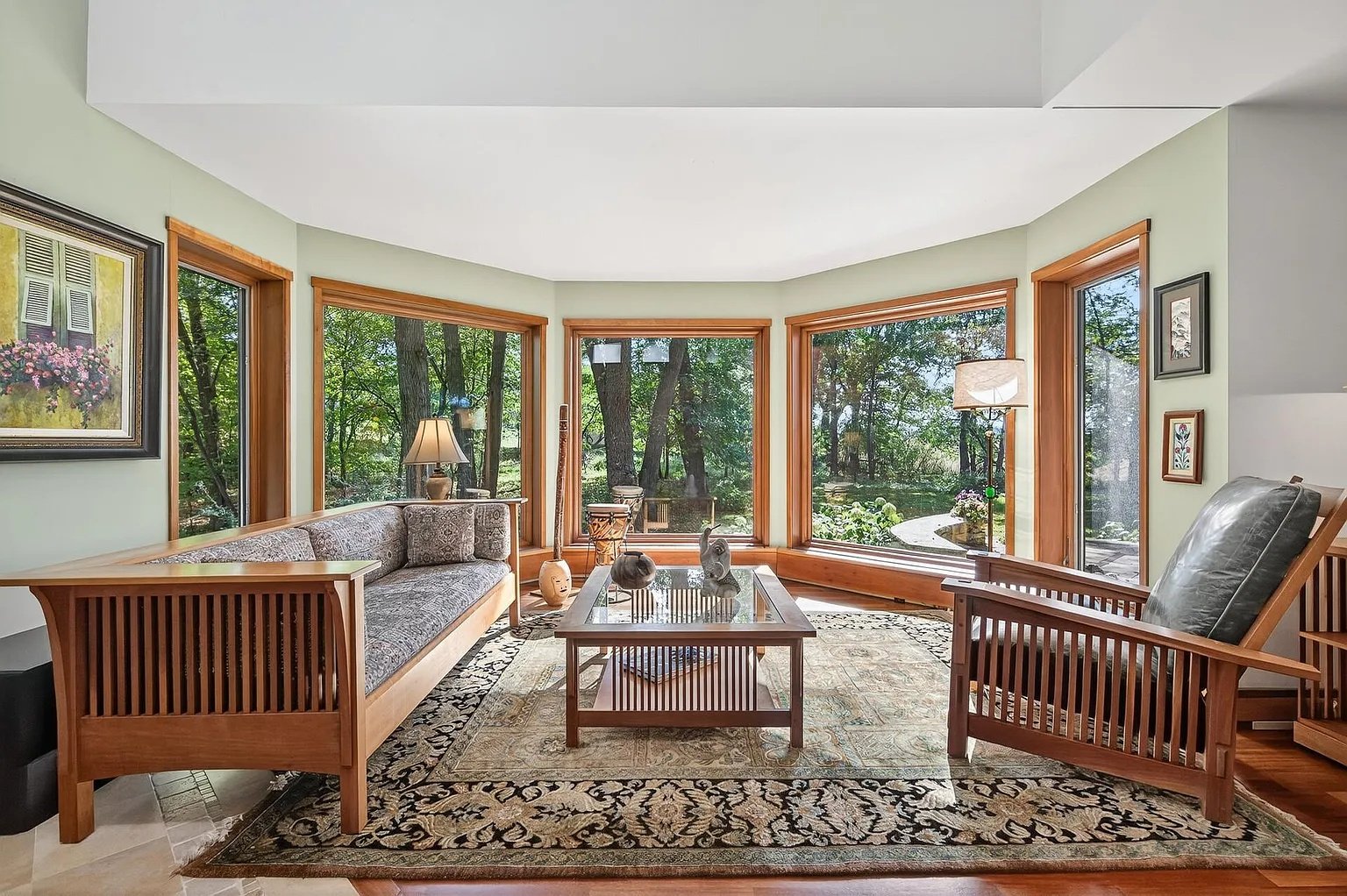 Custom woodwork, stone accents, and artfully placed tile floors weave throughout the home, creating a rich sense of character in every room. Thoughtful architectural details—curved lines, varied ceiling heights, and expansive windows—add interest while contributing to the home’s warm and harmonious aesthetic.