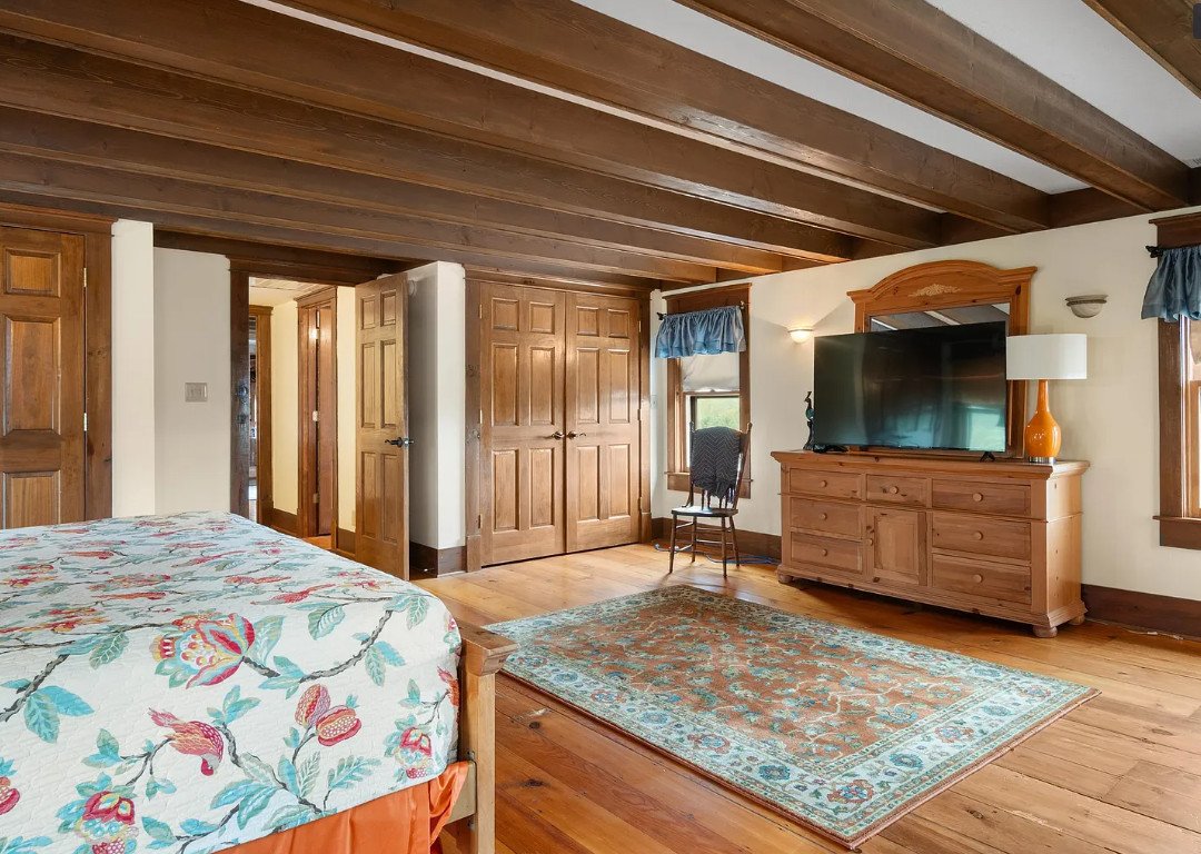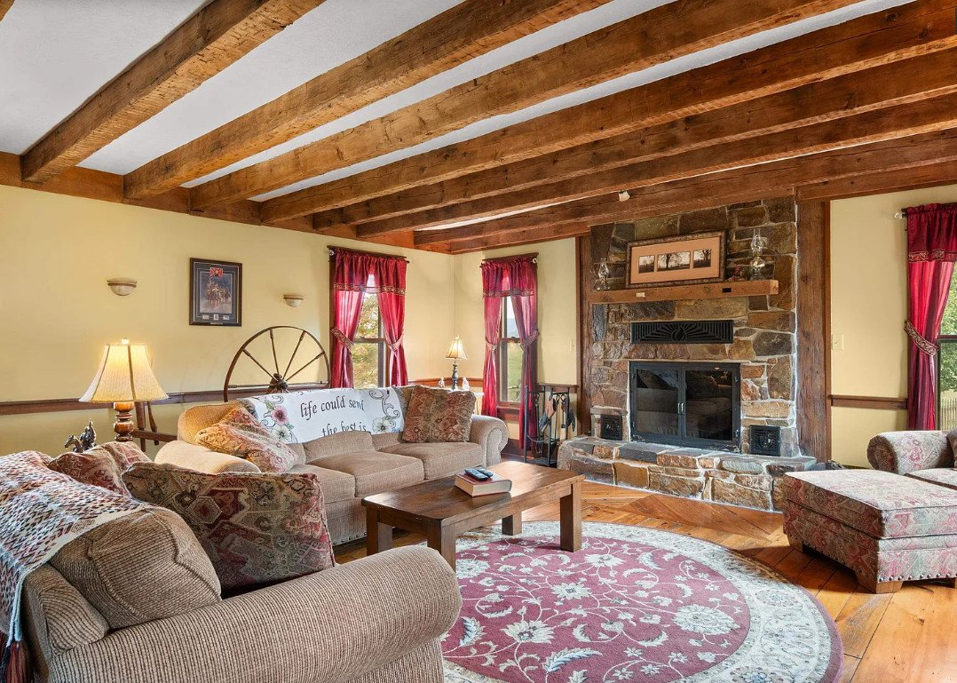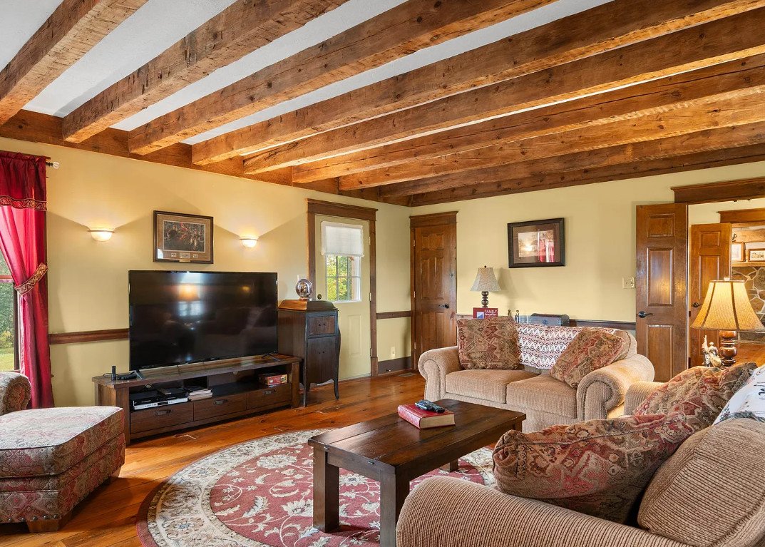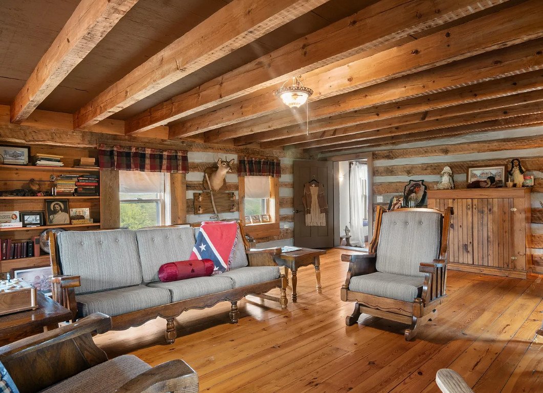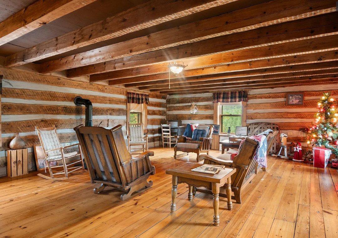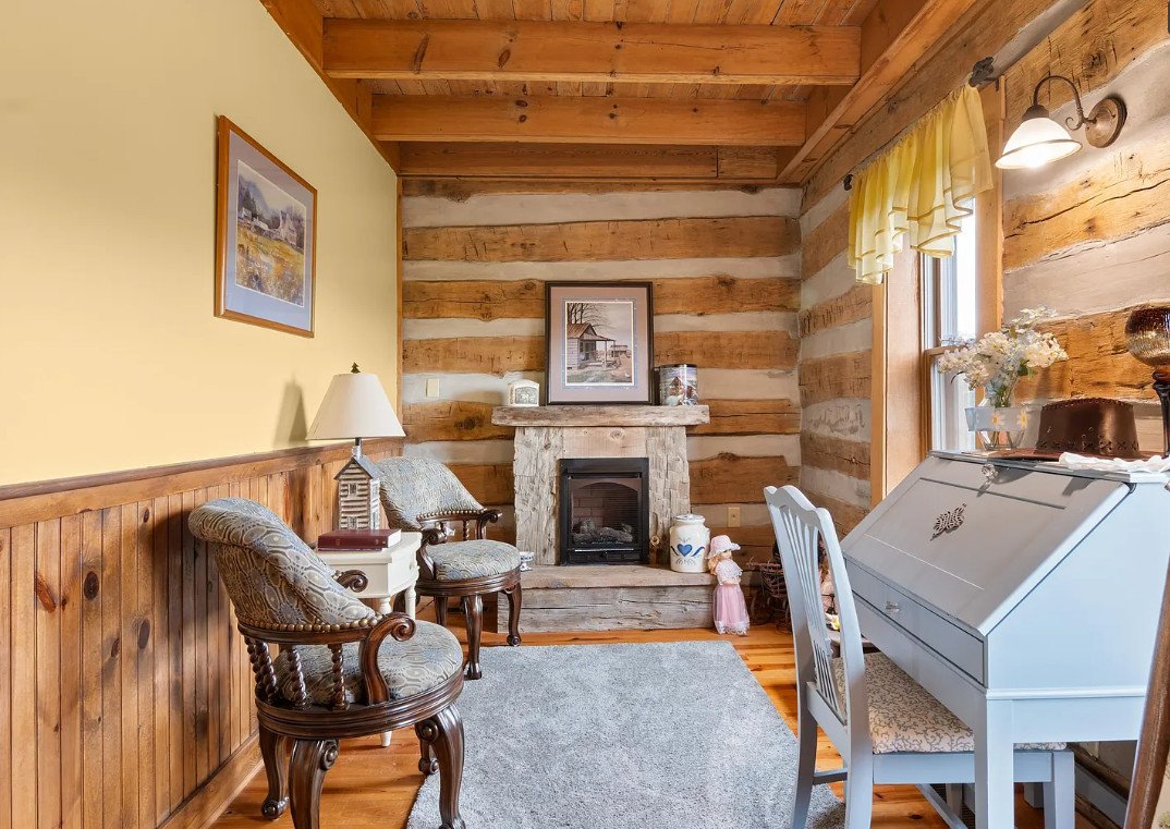 Stepping inside, the home reveals a collection of original and thoughtfully preserved details. Wide plank wood floors stretch from room to room, carrying the marks and warmth of generations. Broad baseboards and exposed beams contribute to the authentic log-home atmosphere, giving each space a grounded, natural feeling.