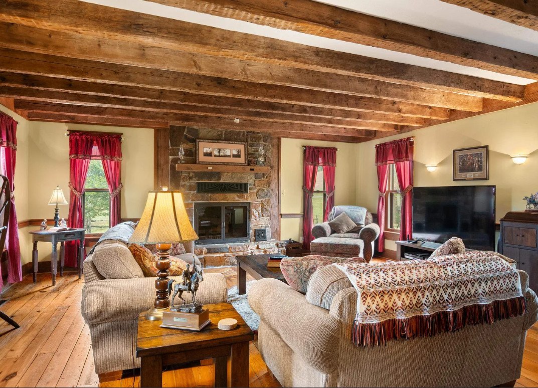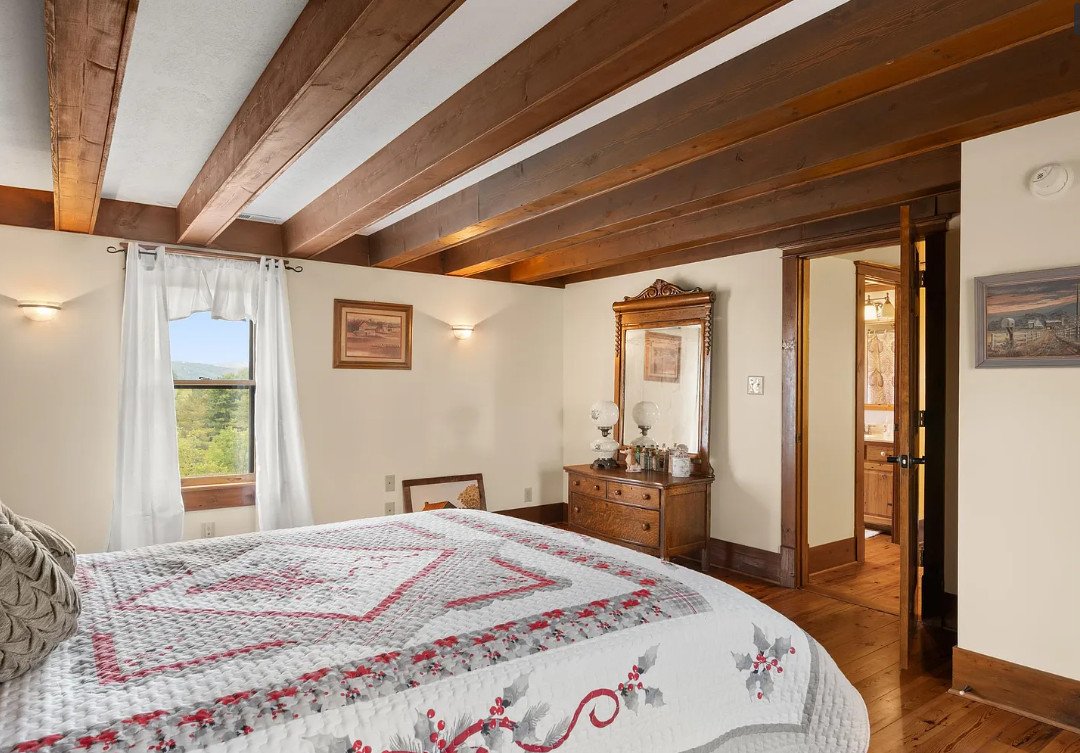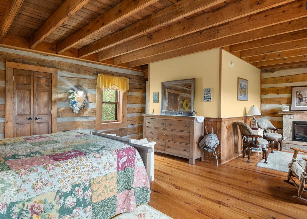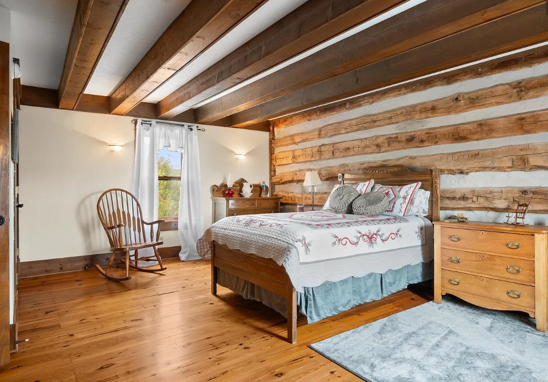 With three bedrooms and three bathrooms, the home offers a practical layout for guests, family, or anyone who appreciates generous interior space. Each bedroom has its own character, some enjoying views of rolling hills and others showcasing exposed log walls or timber beams. Updated bathrooms blend seamlessly with the home’s historic aesthetic, offering stylish fixtures and thoughtfully chosen finishes.