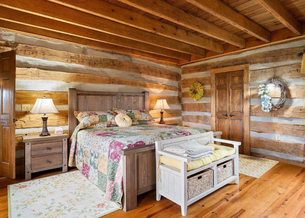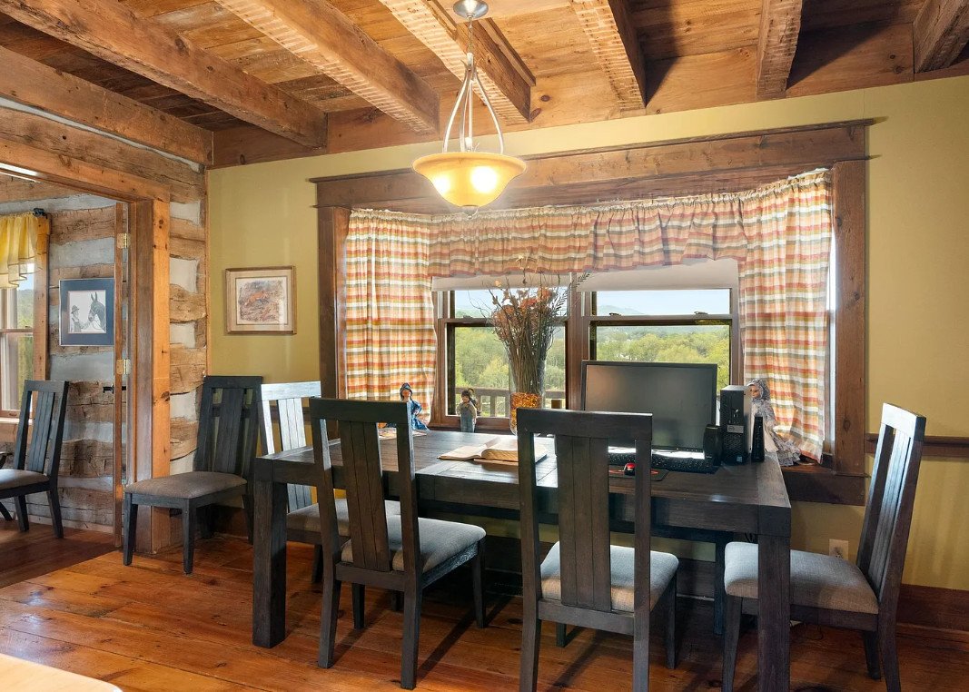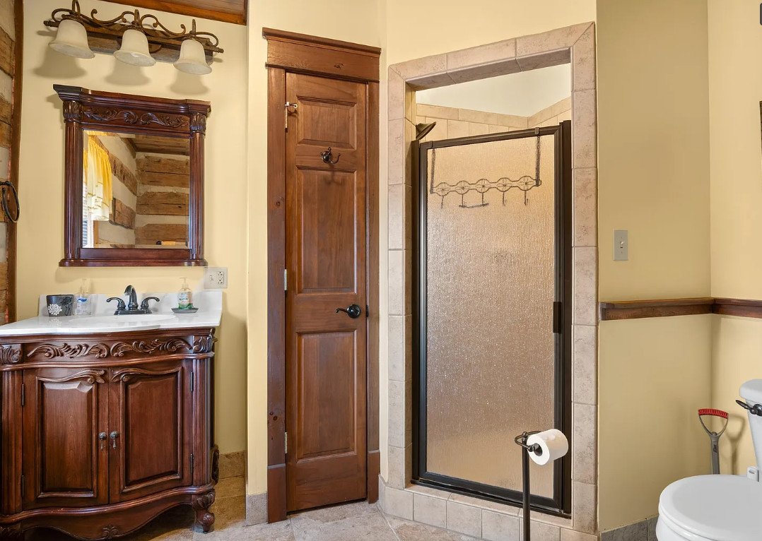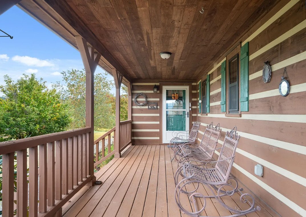 With three bedrooms and three bathrooms, the home offers a practical layout for guests, family, or anyone who appreciates generous interior space. Each bedroom has its own character, some enjoying views of rolling hills and others showcasing exposed log walls or timber beams. Updated bathrooms blend seamlessly with the home’s historic aesthetic, offering stylish fixtures and thoughtfully chosen finishes.