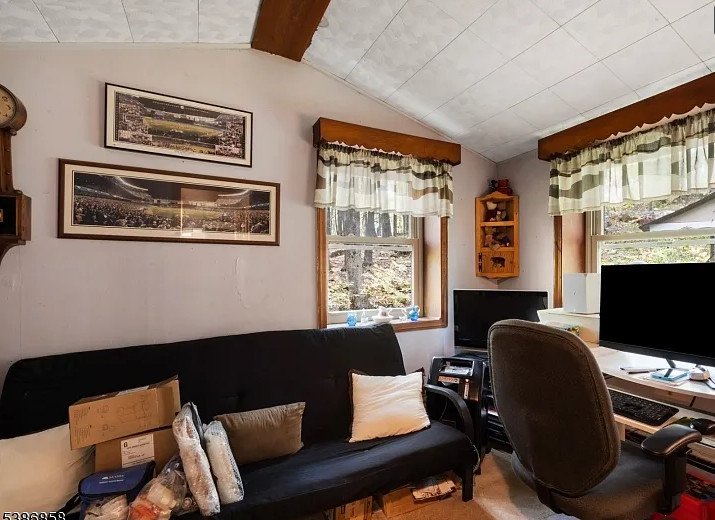 The living room, anchored by the magnificent stone fireplace, serves as the heart of the cottage. Here, crackling winter fires and quiet summer mornings share the same space, making it a room that welcomes every season. A vaulted ceiling lifts the room upward, adding dimension while maintaining the snug, cabin-like feel that makes this property so appealing. Whether used as a year-round home or a beloved weekend escape, the cottage provides a comforting refuge from the rush of modern life.
