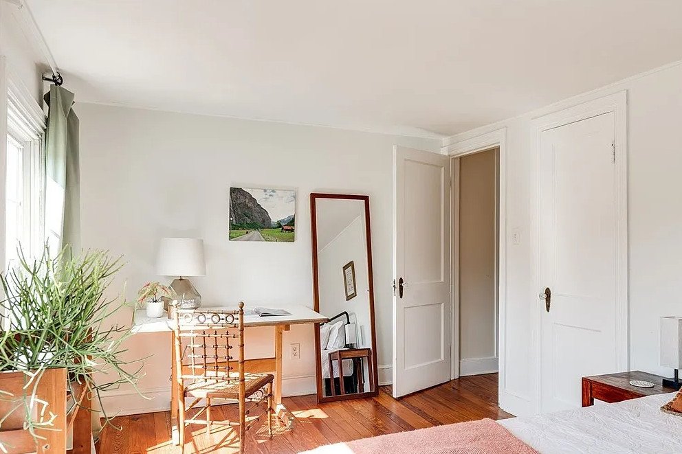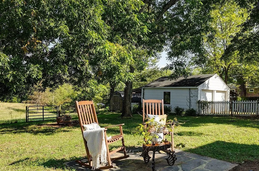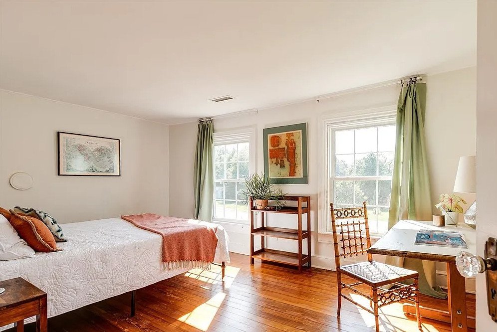 Inside, the farmhouse spans 1,957 square feet and features four bedrooms and three bathrooms, offering ample space for family living or hosting guests. Original hardwood and heart pine floors run throughout the main living areas, imparting warmth and character.