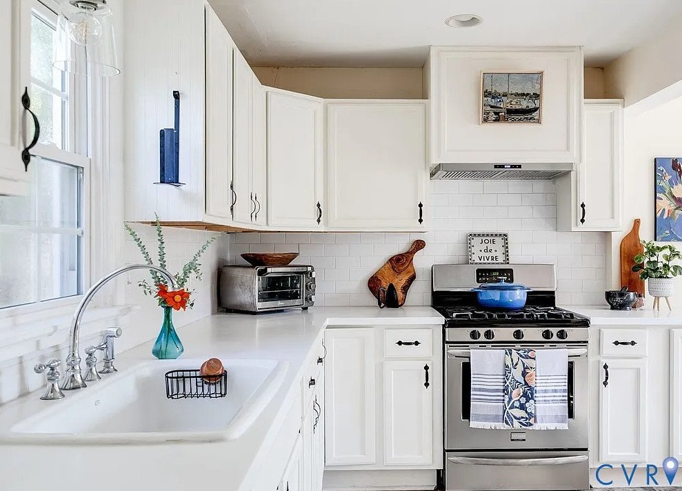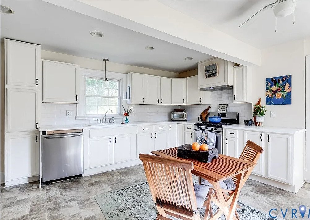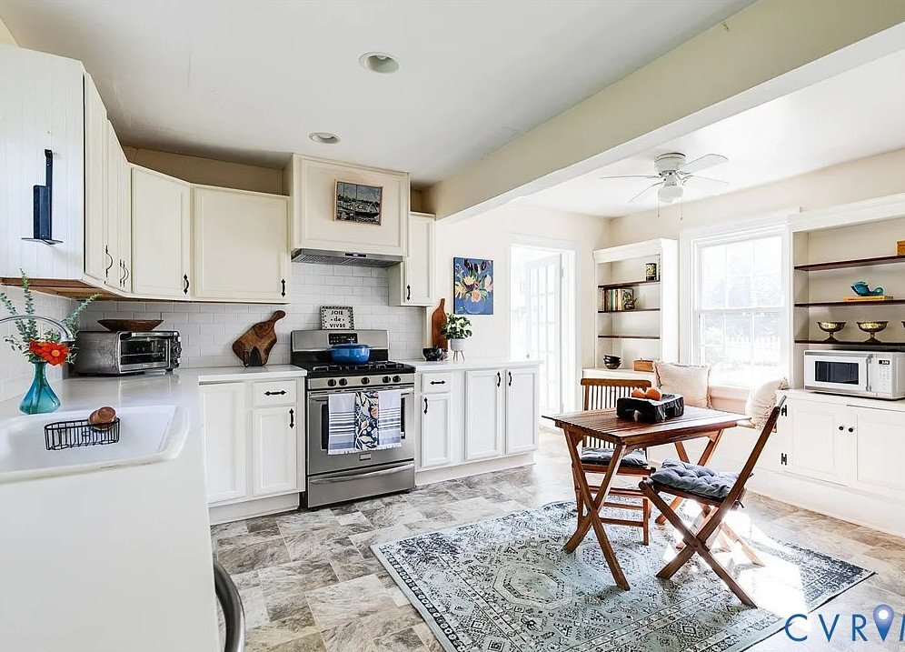 The heart of the home, the eat-in kitchen, blends vintage appeal with modern efficiency. Quartz countertops, stainless steel appliances, and a spacious pantry cater to contemporary culinary needs, while built-in shelving adds practicality and style. The kitchen’s bright, open layout encourages family gatherings and casual dining, making it a central hub of the home.