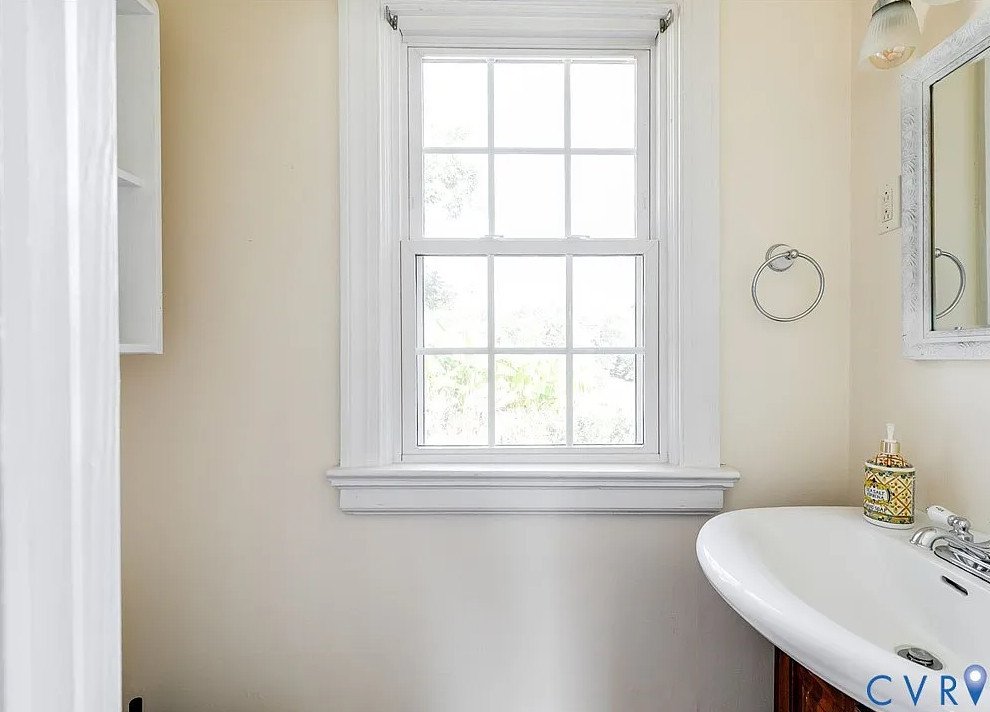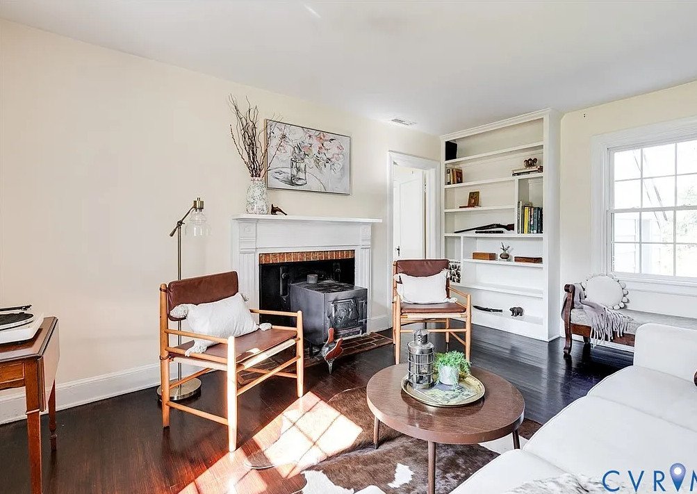 Baseboards and built-in bookshelves complement the historic charm while providing functional storage and display space. Natural light floods the home, highlighting these classic features and creating an inviting, airy atmosphere in every room.