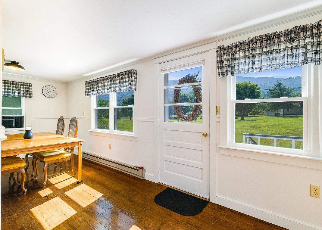 Inside, the farmhouse reveals a warm and thoughtfully preserved interior. Wood floors, baseboards, and chair rails add subtle elegance while grounding the rooms in traditional materials. These details, simple yet enduring, provide a backdrop that highlights the home’s age without overwhelming the space.