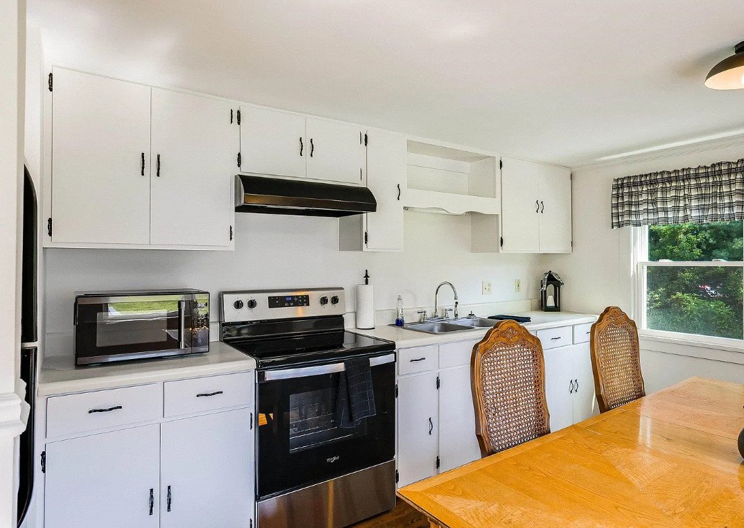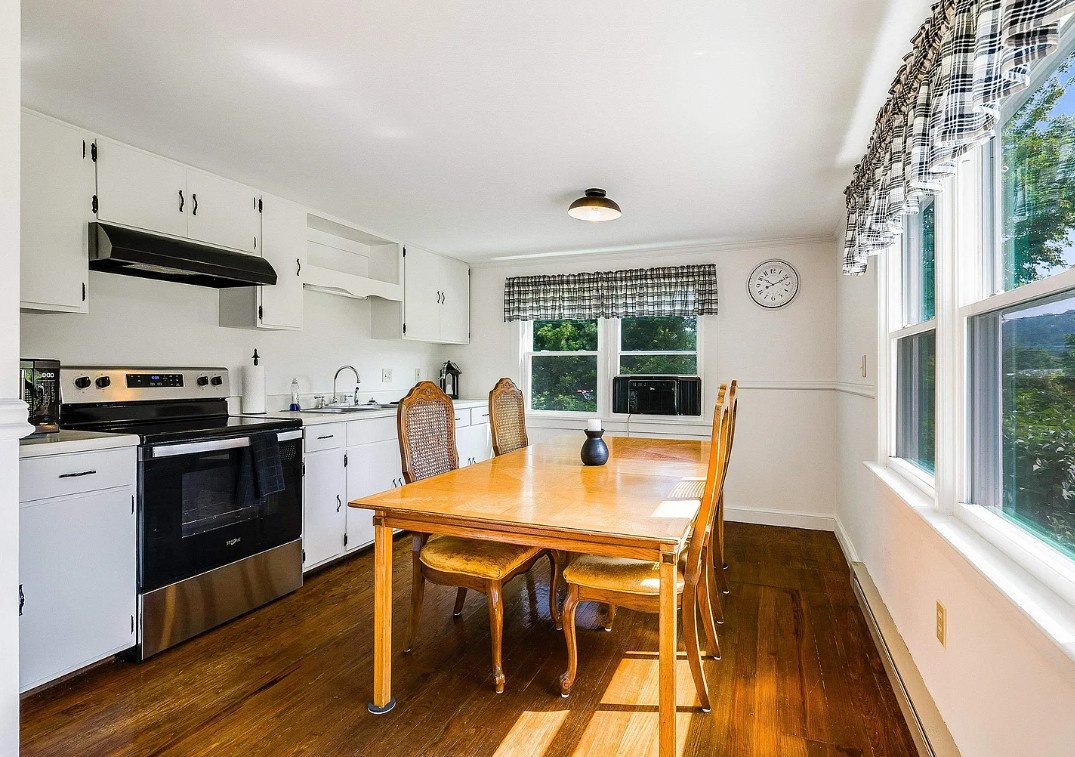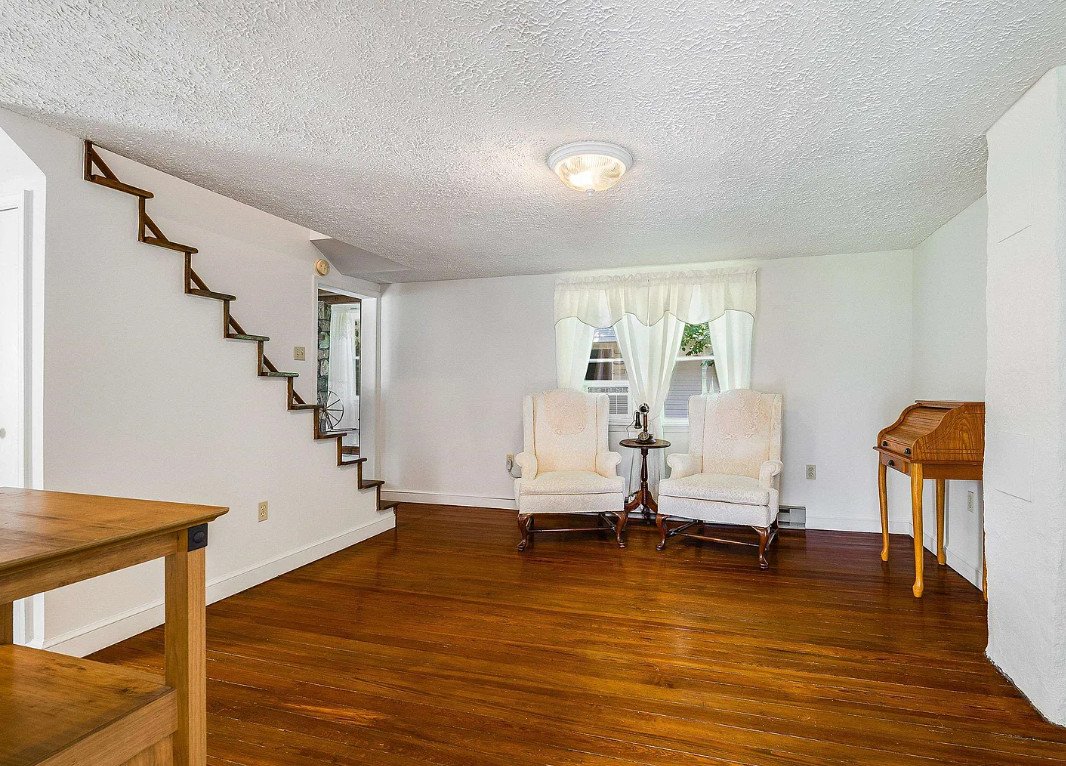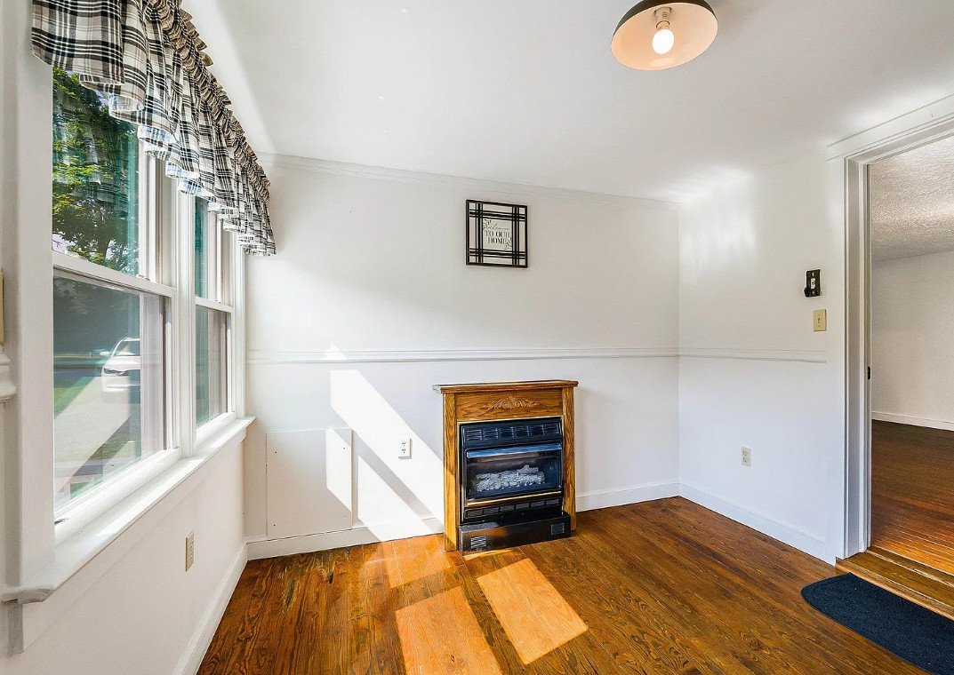 Inside, the farmhouse reveals a warm and thoughtfully preserved interior. Wood floors, baseboards, and chair rails add subtle elegance while grounding the rooms in traditional materials. These details, simple yet enduring, provide a backdrop that highlights the home’s age without overwhelming the space.