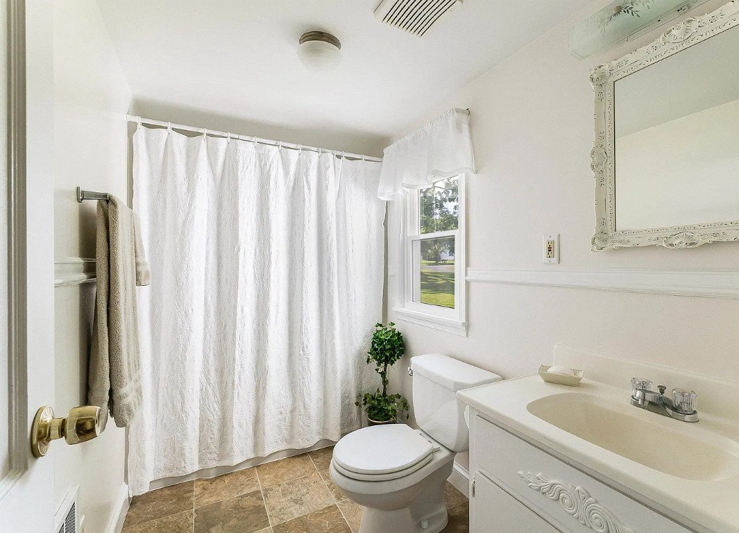 The farmhouse includes three bedrooms and two bathrooms, providing a layout that balances comfort with practicality. Each bedroom offers its own sense of retreat, filled with natural light and views of the surrounding property. The bathrooms, thoughtfully updated, blend modern convenience with the home’s historic character, ensuring that everyday needs are met without compromising the integrity of the house.