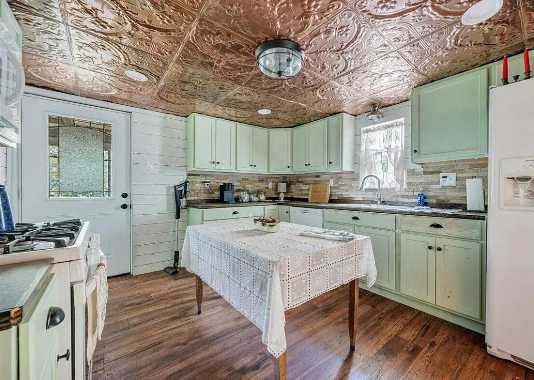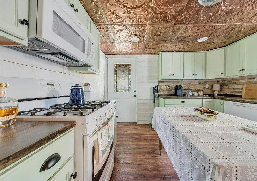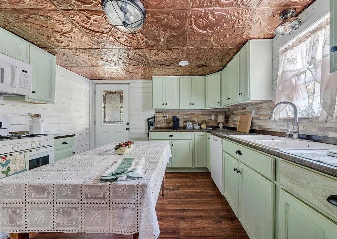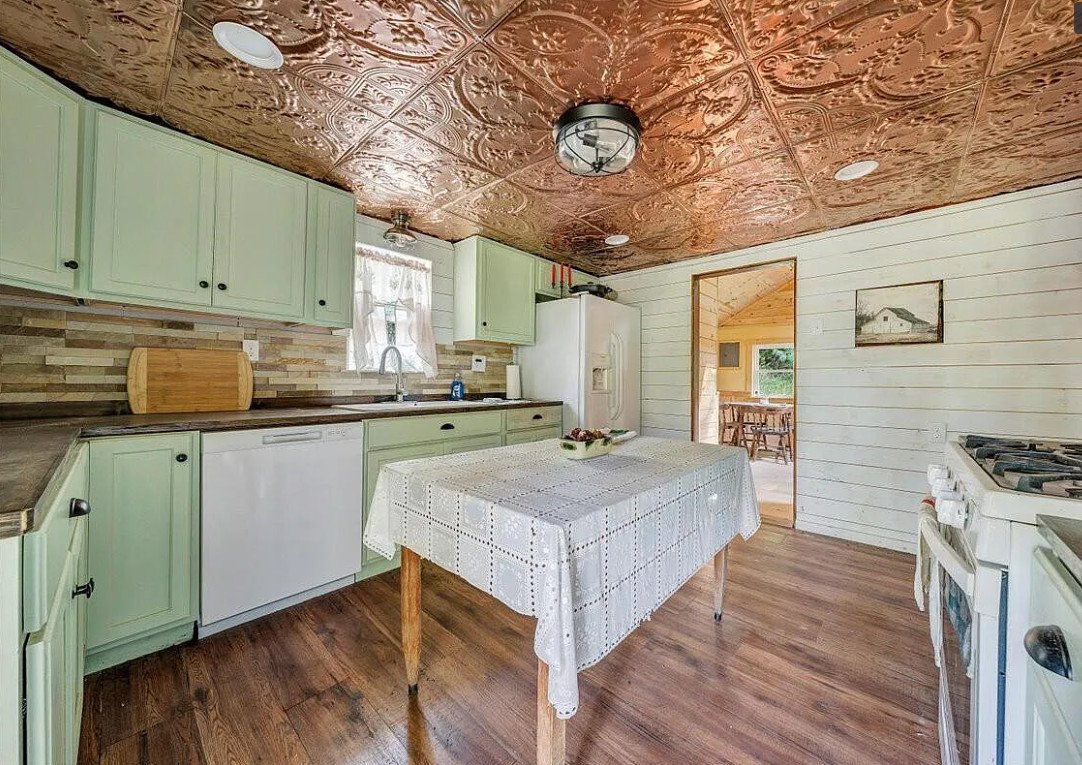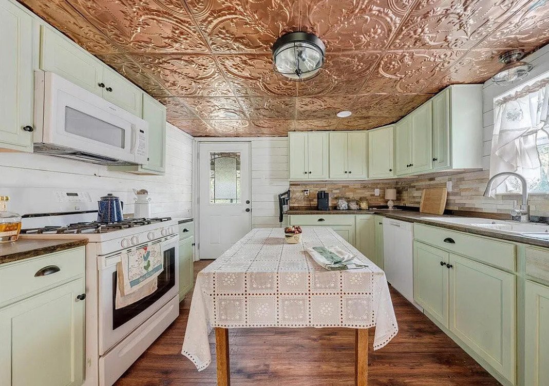 The use of wainscoting and pressed tin ceiling details adds another layer of visual interest, hinting at traditional influences while maintaining a timeless appeal. Portions of the home feature wood floors, grounding the interior with natural materials that complement the surrounding landscape.