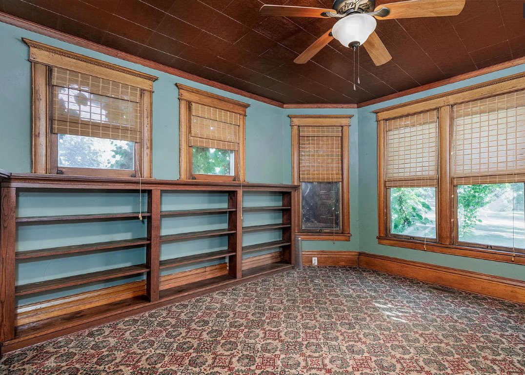 Built-in cabinets remain intact, offering both beauty and practicality, and serving as tangible reminders of a time when storage was seamlessly integrated into architectural design.