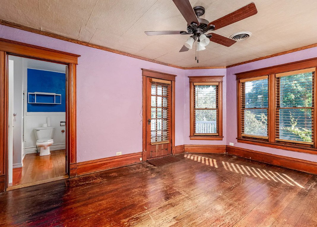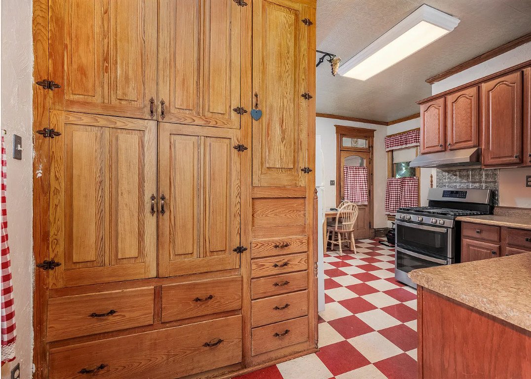 Built-in cabinets remain intact, offering both beauty and practicality, and serving as tangible reminders of a time when storage was seamlessly integrated into architectural design.