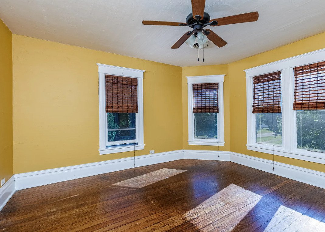 Stepping inside, one is greeted by warm wood floors that extend throughout much of the home, their natural patina reflecting over a century of use. Original baseboards and crown moulding frame the rooms with quiet sophistication, reinforcing the attention to detail that defined early twentieth-century construction.
