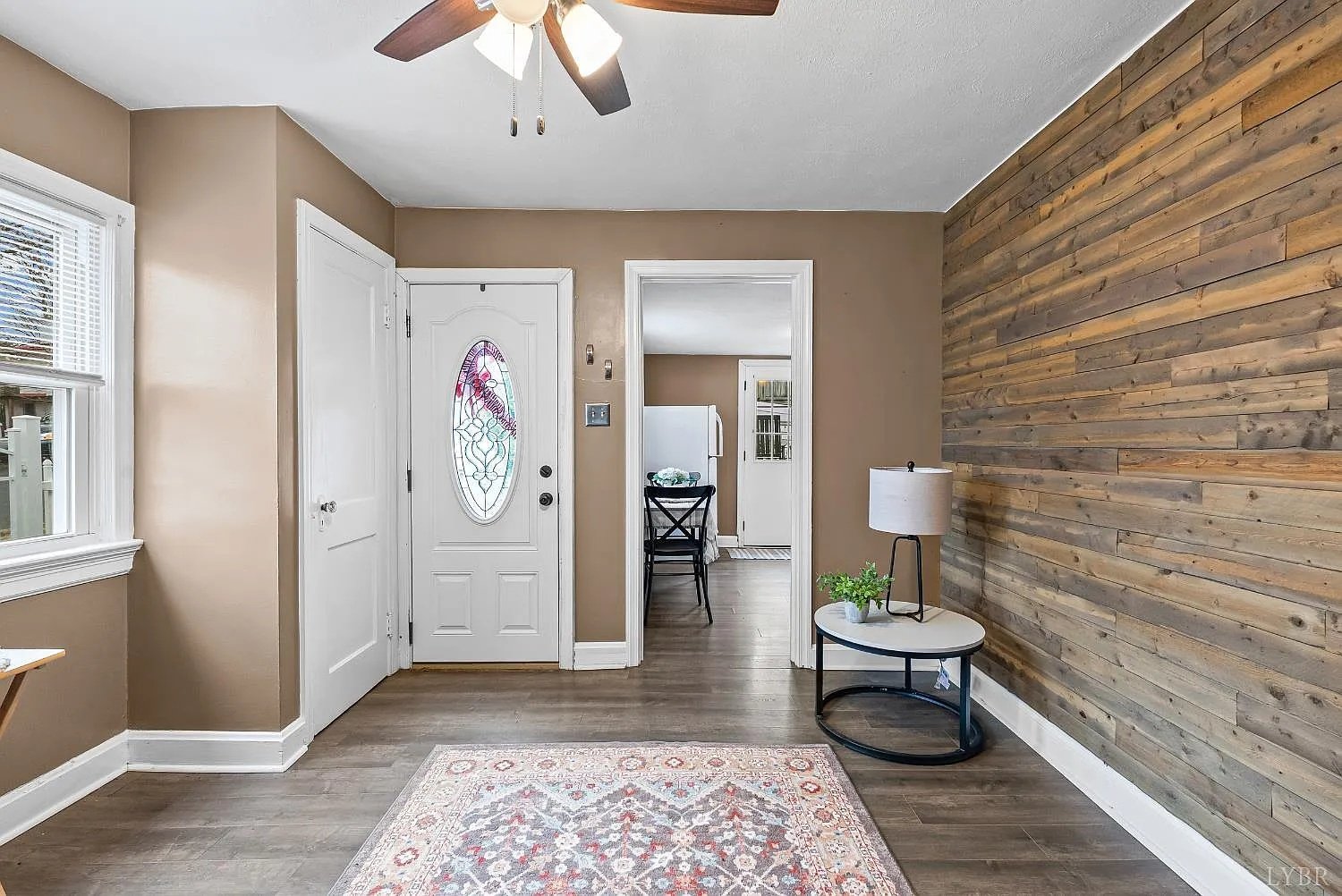 Stepping inside, the interior immediately reflects the character of its era, with plaster walls and paneling details that add warmth and a sense of history. The living room, measuring approximately 11 by 11 feet, serves as the heart of the home. Though compact, it is well-proportioned and comfortable, offering enough space for seating and relaxation without feeling cramped. Laminate flooring runs throughout much of the home, providing durability and ease of maintenance while maintaining a clean and cohesive look.