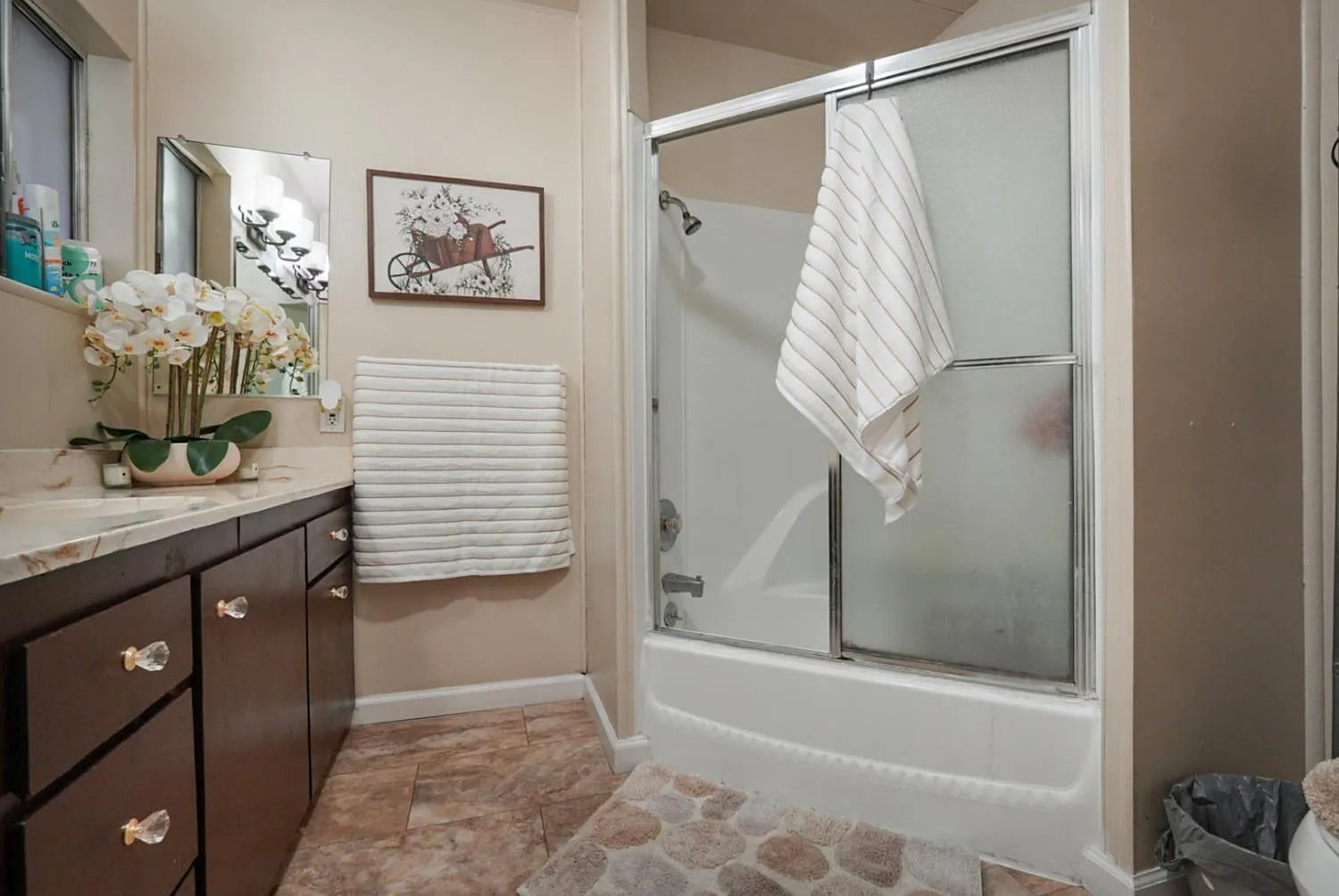 With three well-proportioned bedrooms, the home provides ample private space for rest and relaxation. Each bedroom is designed to be adaptable, suitable for use as a primary sleeping area, guest room, or even a home office or hobby space. The two full bathrooms add a layer of comfort and convenience, ensuring that daily routines remain smooth and unhurried, even during busy mornings.