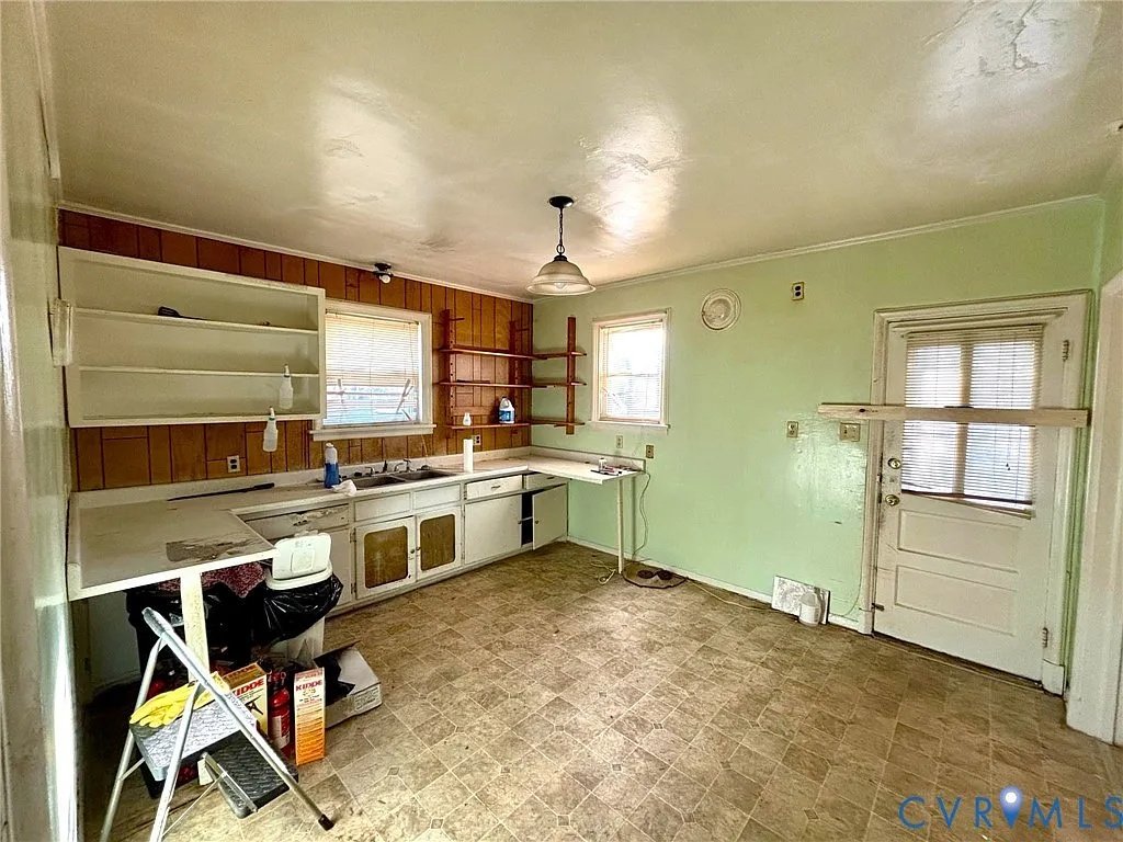 The eat-in kitchen provides generous room proportions and a practical layout, enhanced by vinyl flooring and ample space for everyday dining. Nearby, a separate laundry room with cabinetry reinforces the home’s thoughtful design, keeping essential functions organized and discreetly placed. This separation of living, dining, and service areas reflects a layout that was both progressive for its time and still highly functional today.