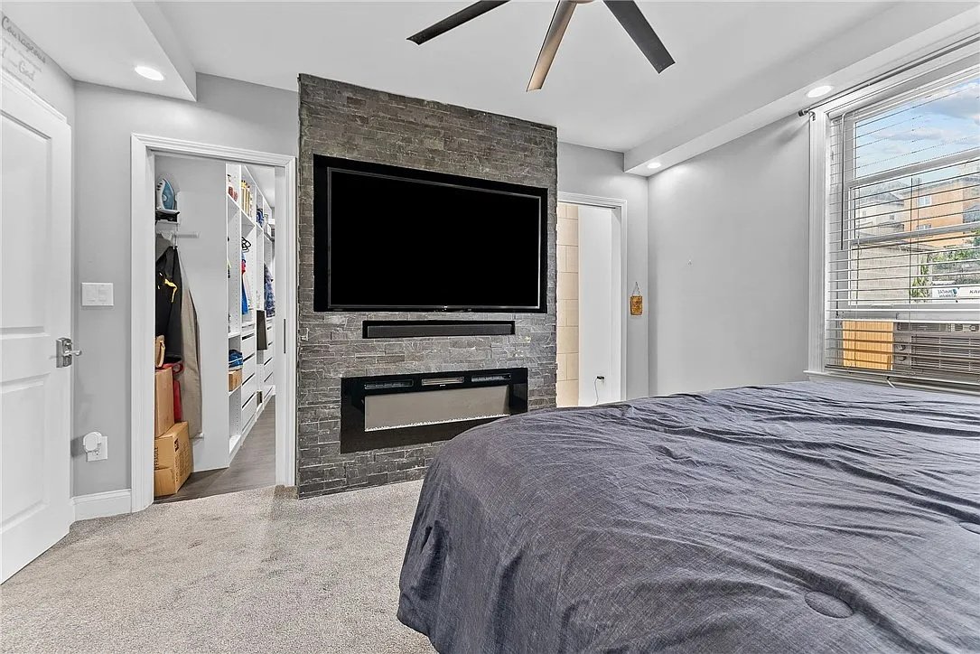 Ascending to the upper floors reveals the private quarters of the residence. The primary bedroom functions as a true owner’s suite, offering a sense of retreat and refinement. An electric fireplace adds warmth and ambiance, while the walk-in closet provides generous storage. The fully updated primary bathroom stands out as a highlight, featuring double sinks and a spacious, contemporary shower that blends modern design with everyday comfort. The placement of the laundry area just outside the primary suite adds a layer of convenience that enhances daily living.