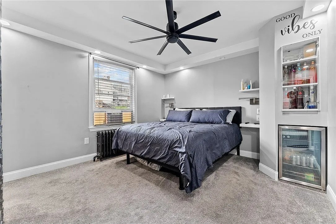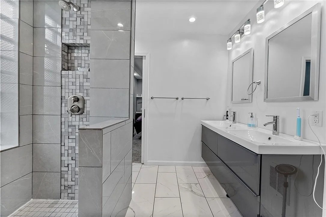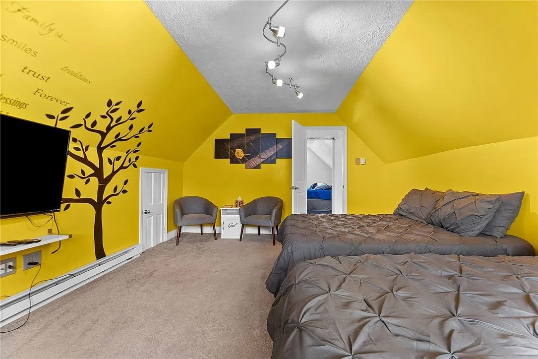 Ascending to the upper floors reveals the private quarters of the residence. The primary bedroom functions as a true owner’s suite, offering a sense of retreat and refinement. An electric fireplace adds warmth and ambiance, while the walk-in closet provides generous storage. The fully updated primary bathroom stands out as a highlight, featuring double sinks and a spacious, contemporary shower that blends modern design with everyday comfort. The placement of the laundry area just outside the primary suite adds a layer of convenience that enhances daily living.