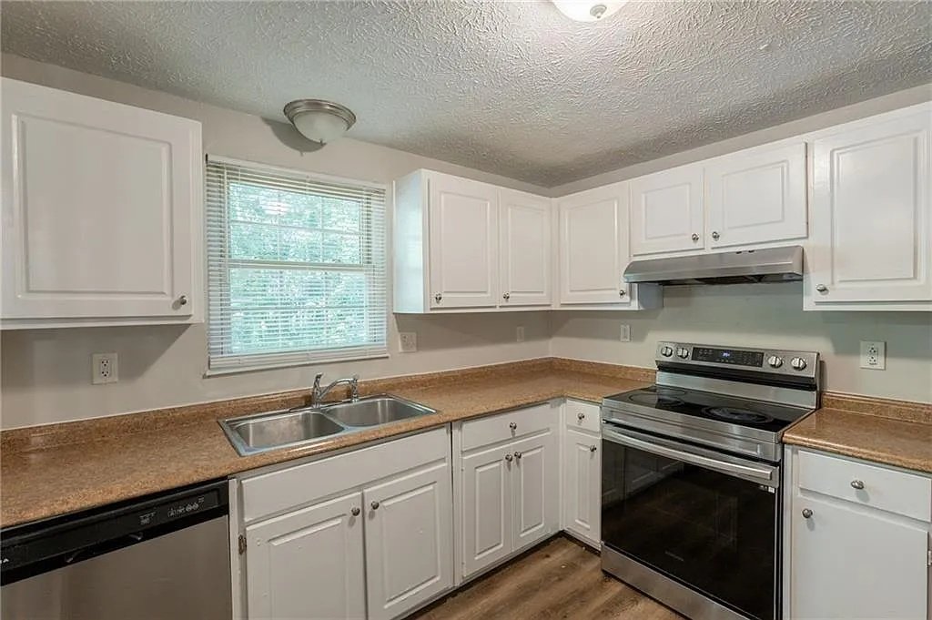 The kitchen is conveniently positioned off the main living area, allowing for efficient access during meals and entertaining. White cabinetry keeps the space bright, while laminate countertops offer practicality for everyday use. Included appliances—such as a dishwasher, electric range, and refrigerator—support a move-in-ready experience. The kitchen’s placement reinforces the home’s functional design, keeping the heart of daily activity connected to the rest of the main level.