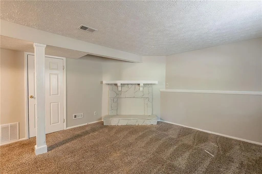 The lower level expands the living space further with a family room anchored by a decorative stone fireplace. This area offers a warmer, more relaxed atmosphere compared to the main living space, making it ideal for unwinding, movie nights, or casual entertaining. The fireplace serves as a visual focal point, adding character and a sense of comfort to the room even when not in use. The lower level’s separation from the main floor allows different activities to happen simultaneously without disruption.
