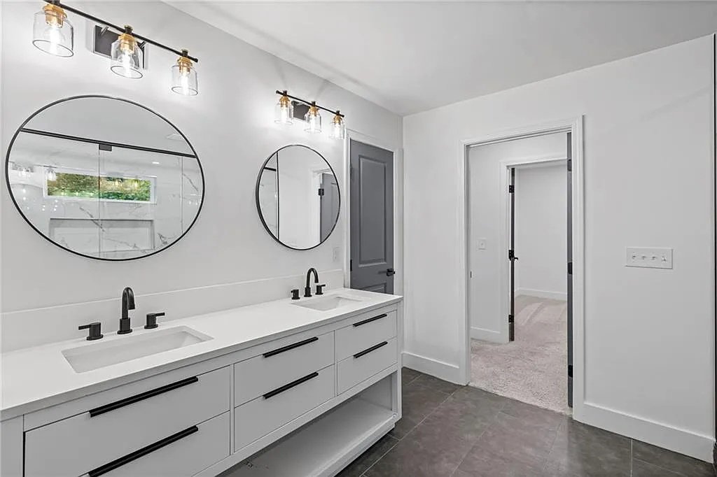 Two additional full bathrooms on the upper level ensure comfort and convenience, particularly for busy mornings or households with multiple occupants. Each bathroom is well-appointed, maintaining the home’s cohesive design language and attention to detail.