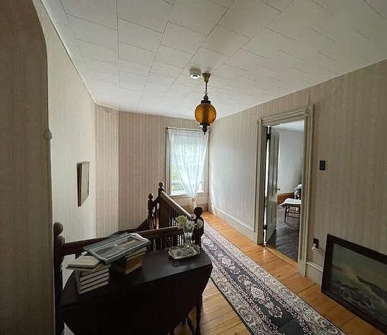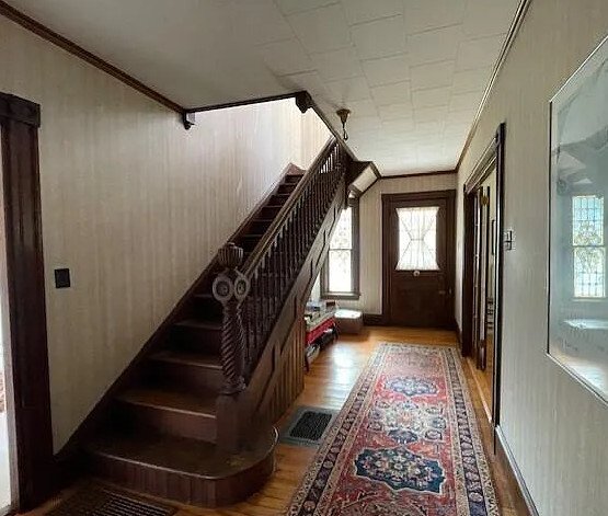 The flooring, likely hardwood extracted from regional forests, shows the gentle patina that only decades can produce. Baseboards and chair rails trace the rooms with a quiet elegance, framing the walls like picture edges, while the staircase offers one of the home’s showpieces: a beautifully turned newel post marking the rise to the second floor.