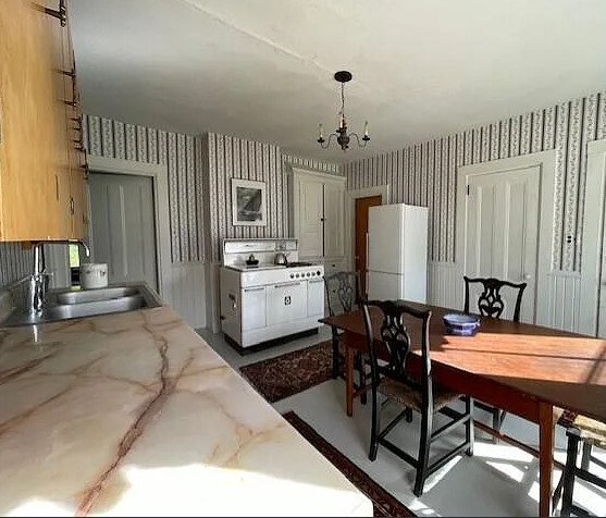 The main floor holds spaces that balance practicality and charm. The formal dining room includes a pass-through china cabinet—one of those wonderfully vintage features that bridges the dining room to the eat-in kitchen, allowing dishes to glide from one space to another. In both rooms, fireplaces lend comfort and historical ambiance. Imagine winter evenings when wood crackles while supper simmers nearby.