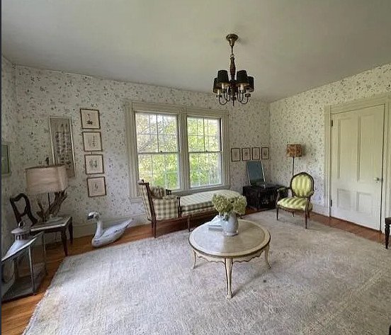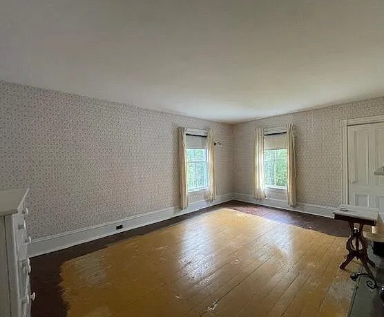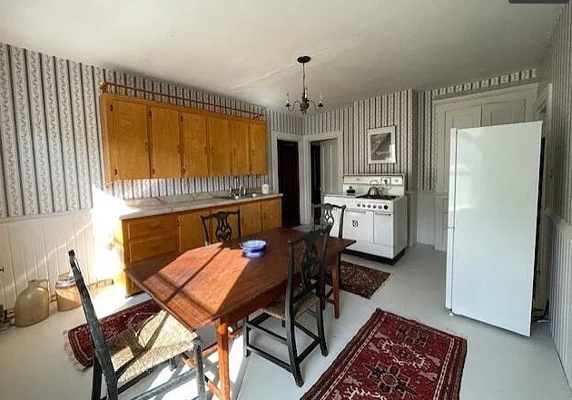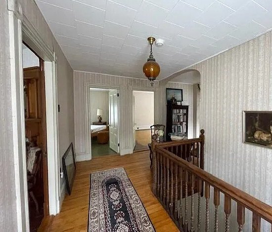 The flooring, likely hardwood extracted from regional forests, shows the gentle patina that only decades can produce. Baseboards and chair rails trace the rooms with a quiet elegance, framing the walls like picture edges, while the staircase offers one of the home’s showpieces: a beautifully turned newel post marking the rise to the second floor.