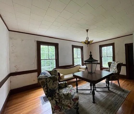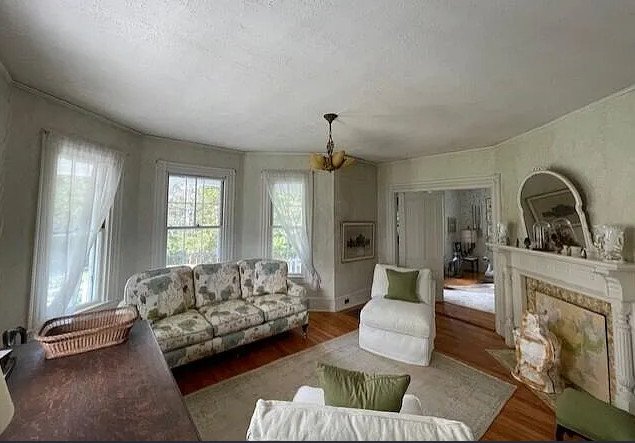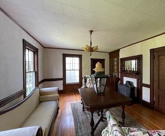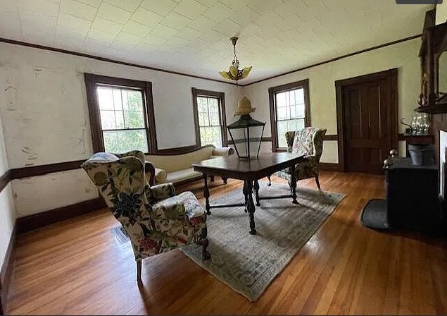 Inside the home, the first impression is warmth. Not just from light, but from wood—rich grain, original floors, and moldings that remind you how much craftsmanship mattered long before mass production became the norm.