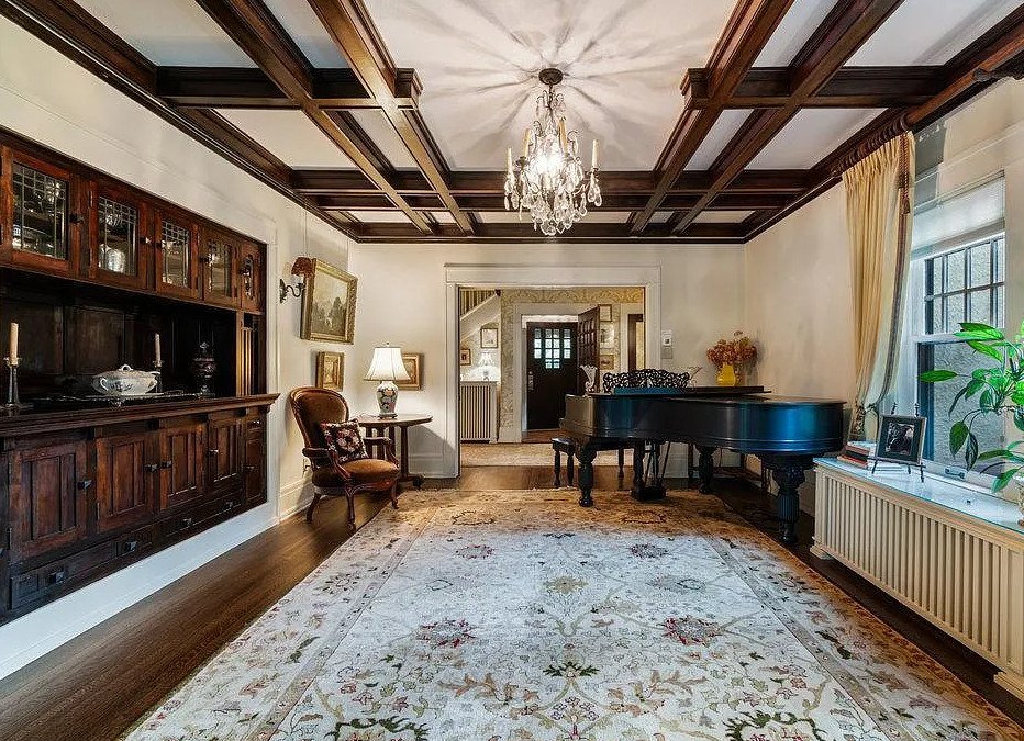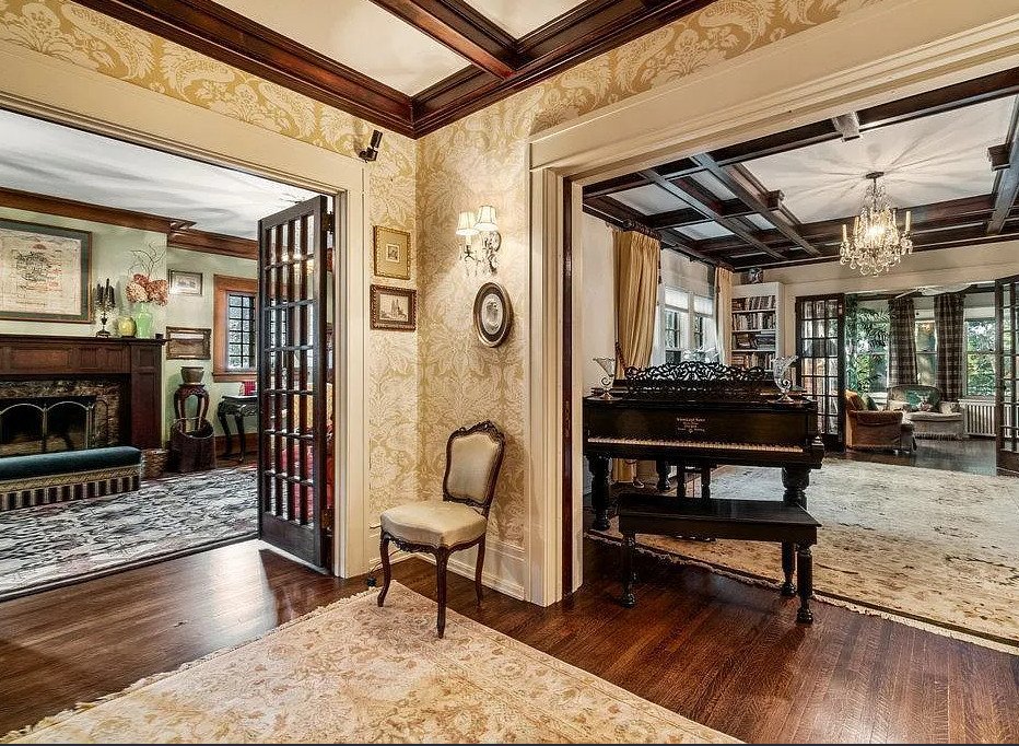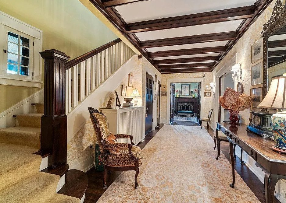 Stepping inside, visitors are greeted by a grand interior rich in period details and timeless materials. The home’s expansive floor plan encompasses over 5,000 square feet, offering generous living areas that balance grandeur with livability. Original hardwood floors flow throughout the main level, their warm patina echoing the footsteps of generations past. Wide baseboards, crown moulding, and intricate woodwork reinforce the craftsmanship typical of the Arts & Crafts movement, which emphasized quality materials, hand-finished details, and enduring design.