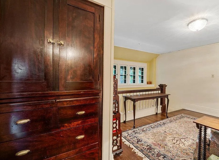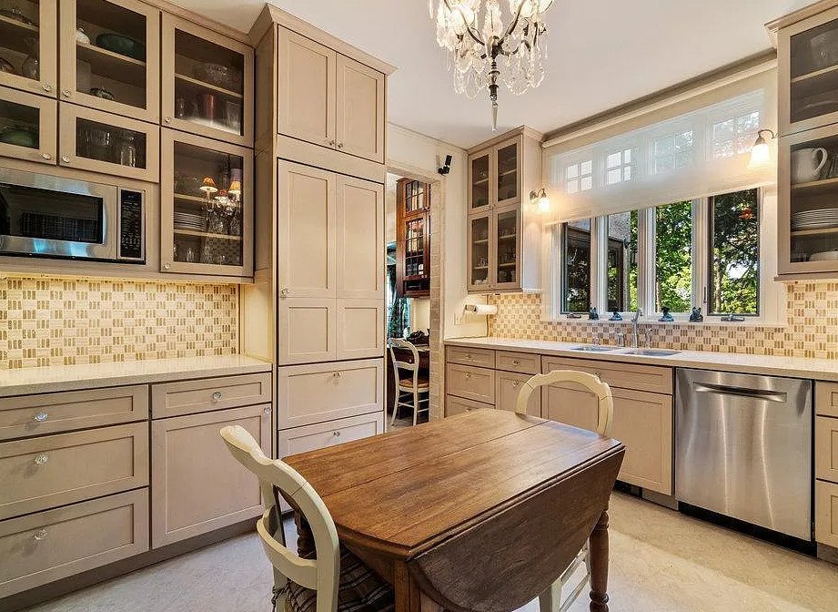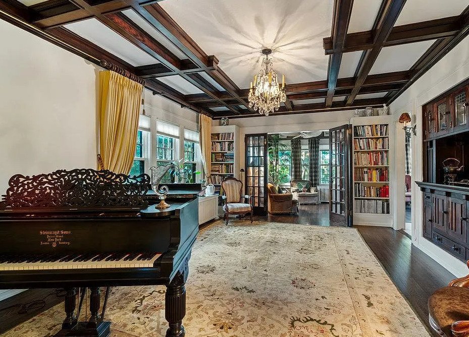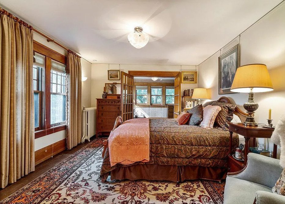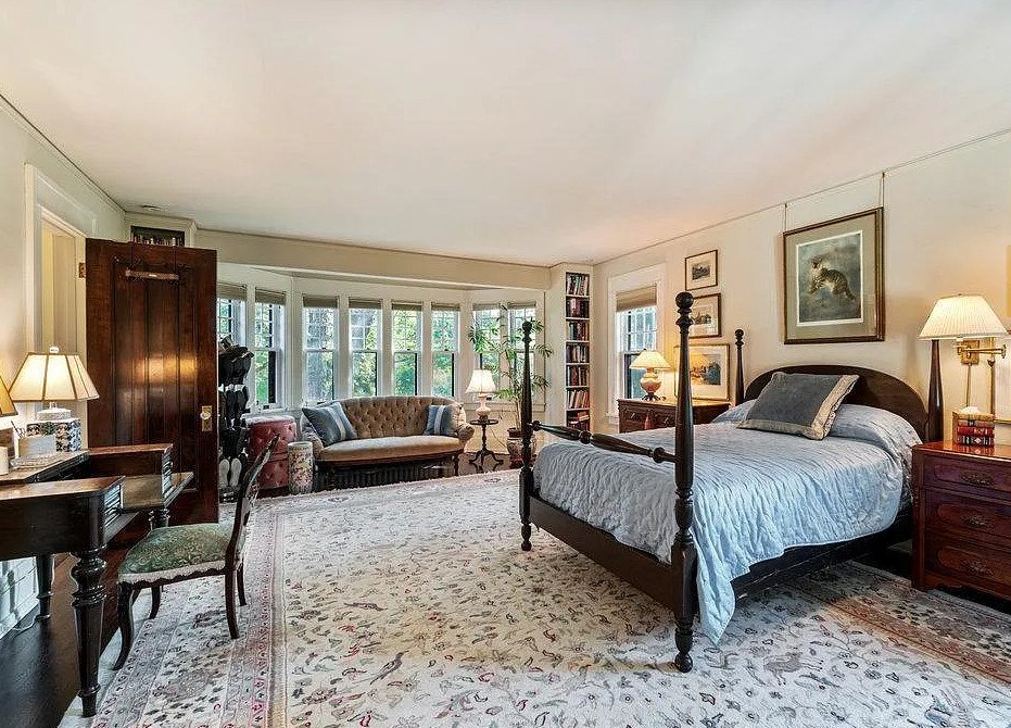 The living spaces themselves are filled with character. A cozy den provides an intimate retreat, ideal for reading or quiet conversation. A library outfitted with custom bookshelves reflects the home’s scholarly and cultured spirit, while a sunroom captures abundant daylight, creating a bright and uplifting environment throughout the year. Built-in window seating adds charm and functionality, offering peaceful vantage points for gazing toward the lake or garden.